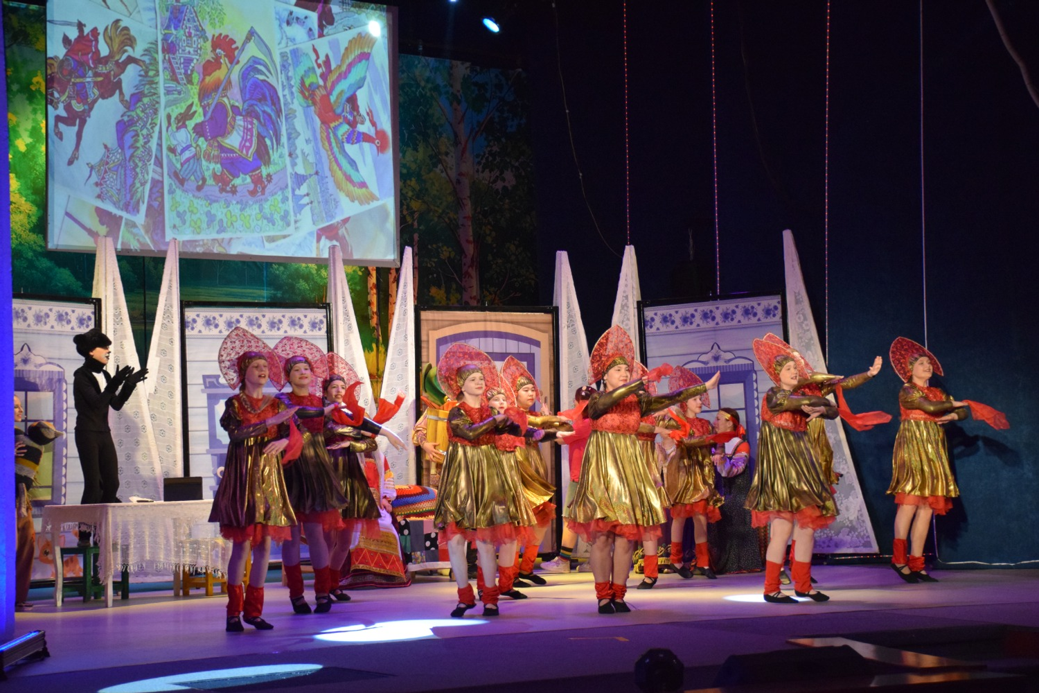 Вместе со сказочными героями зрители делали сказочную зарядку, слушали рассказ об Александре Афанасьеве, отгадывали загадки, смотрели отрывки из мультфильмов «Гуси-лебеди», «По щучьему велению», а потом пустились в пляс, повторяя движения танца за артистами на сцене. Программу украсили и оживили выступления студии «Фантазёры» и театра танца «Вдохновение».
